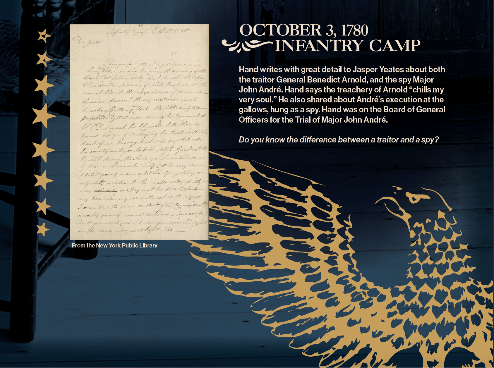 Dividing the information into distinct sections and placing it within “window frame” elements allowed me to evoke the feeling of looking back into a Revolutionary-era tavern, connecting viewers to General Hand’s letters that narrate the era.
