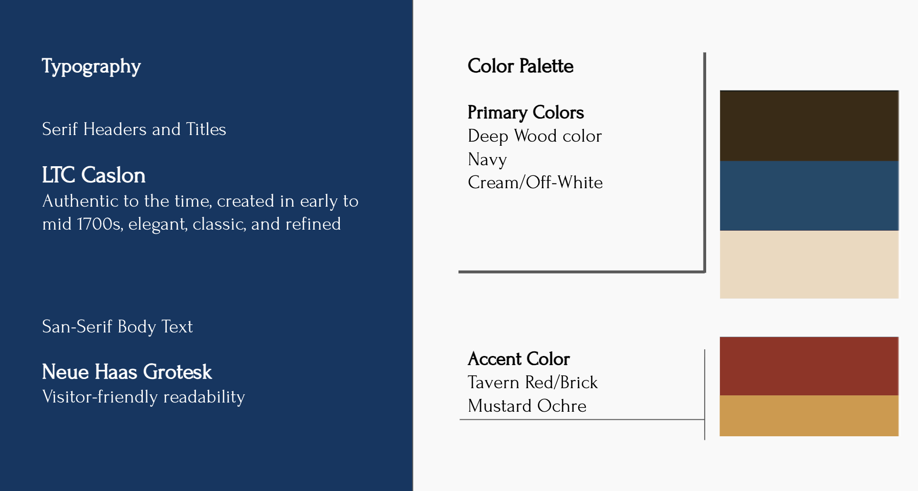 This approach also informed the tavern-inspired aesthetic, referencing the important role taverns played as places where people gathered to converse, exchange news, and discuss revolutionary ideas.